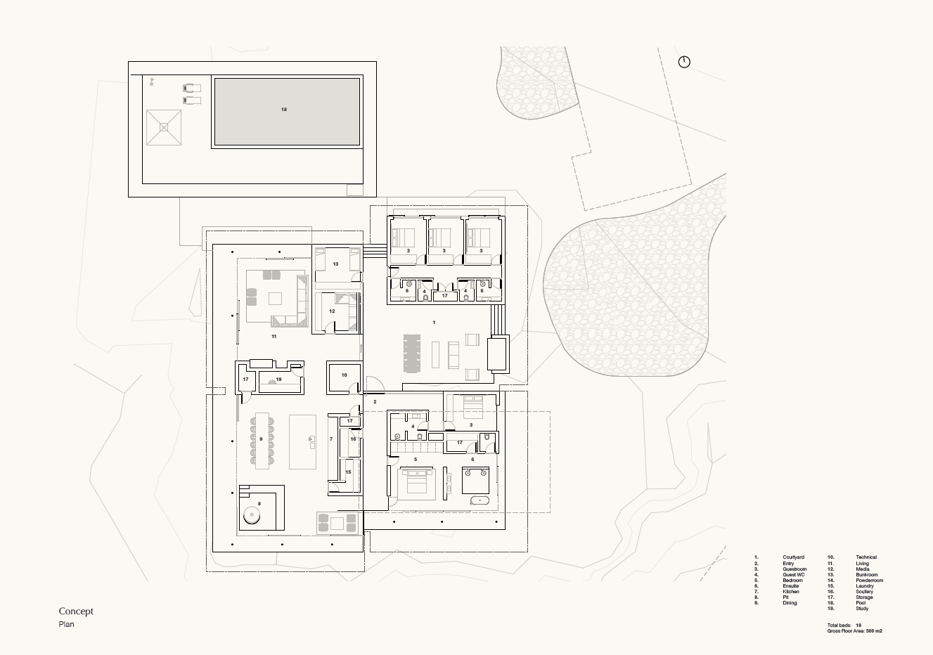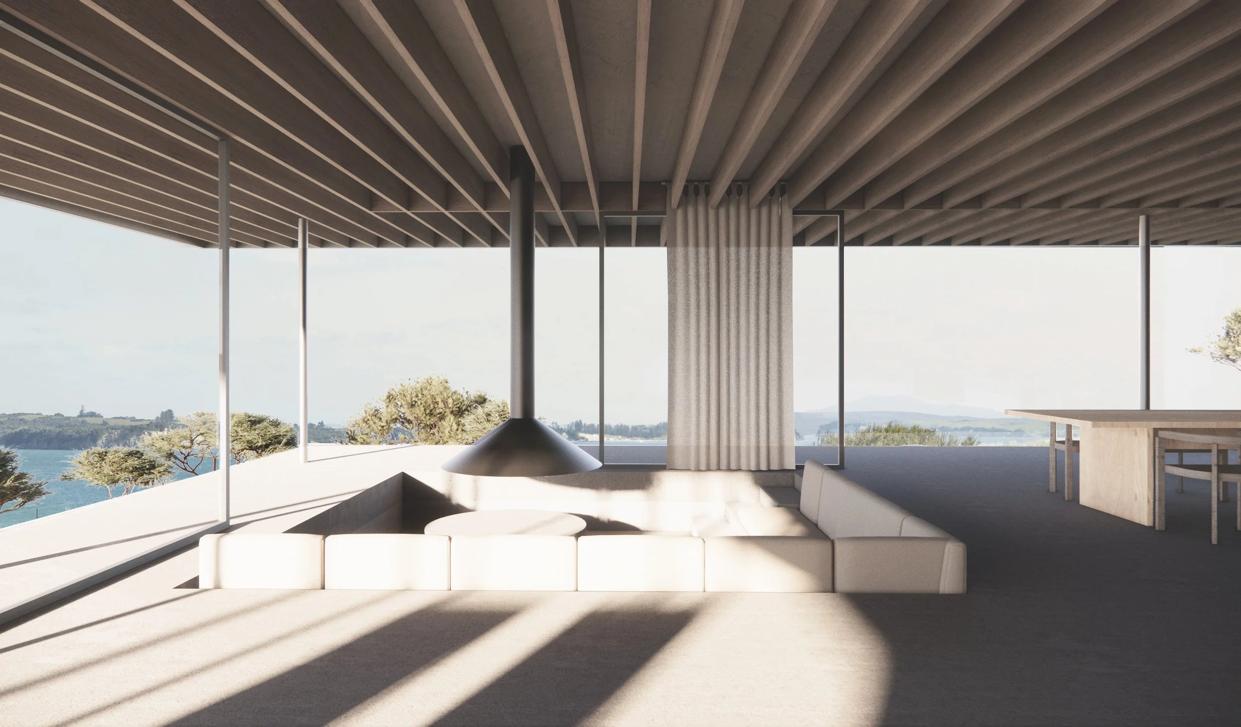 Resting in an elevated location with an outlook over the Mangawhai Estuary, this holiday home is designed with spaces individually positioned for a unique outlook. Split into four areas of use with cross axis running centrally through the building, the Master, Kitchen and Dining, Living and Guest spaces, are separated - but able to be linked as required by occupation. An entrance courtyard provides shelter from wind and rain and a pool to the north links the lawn and living spaces. This is a home which can be adapted for use by 2 or 20 people depending on the occasion.