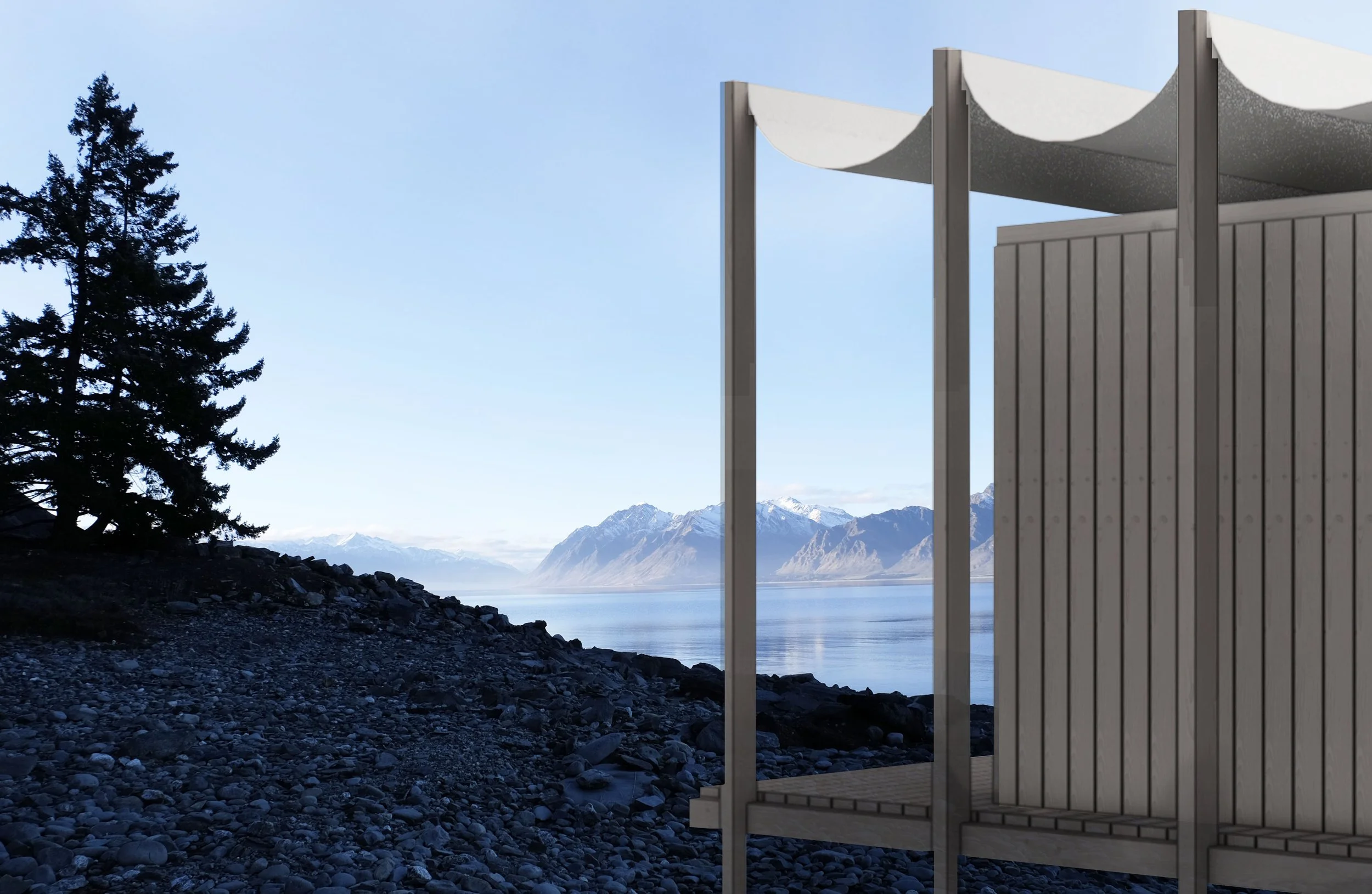 Inspired by tbe Scandianvian ‘winter bathing houses’ in Denmark, Sweden and Finland, the sauna design aims to increase our connection with nature by shifting us from looking at the landscape to be emerged in it. Programme consists of change rooms, toilets, group saunas and a refreshment bar which serves drinks pre and post sauna. Designed as a focal point for visitors, the form and canopy aim to create a unque building with a recognisable identity. The canopy provides shade and shelter for the users throughout all four seasons. The larger aim is to stimulate public swimming in the lake, creating a connection with it. This encourages ownership of the users to take an interest in the health of the lake and surrounding waterways now and in the future.